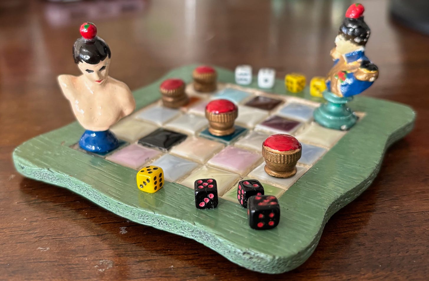 *A game without rules, the fun of Apple on Your Head is in the joy of rolling the dice and moving the pieces around a board grid comprised of one-quarter inch tiles.