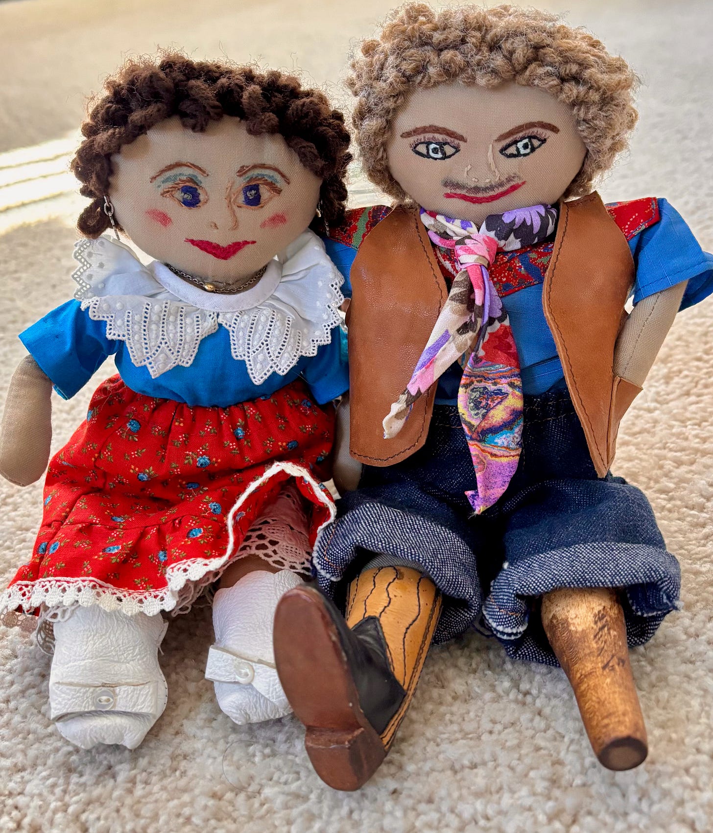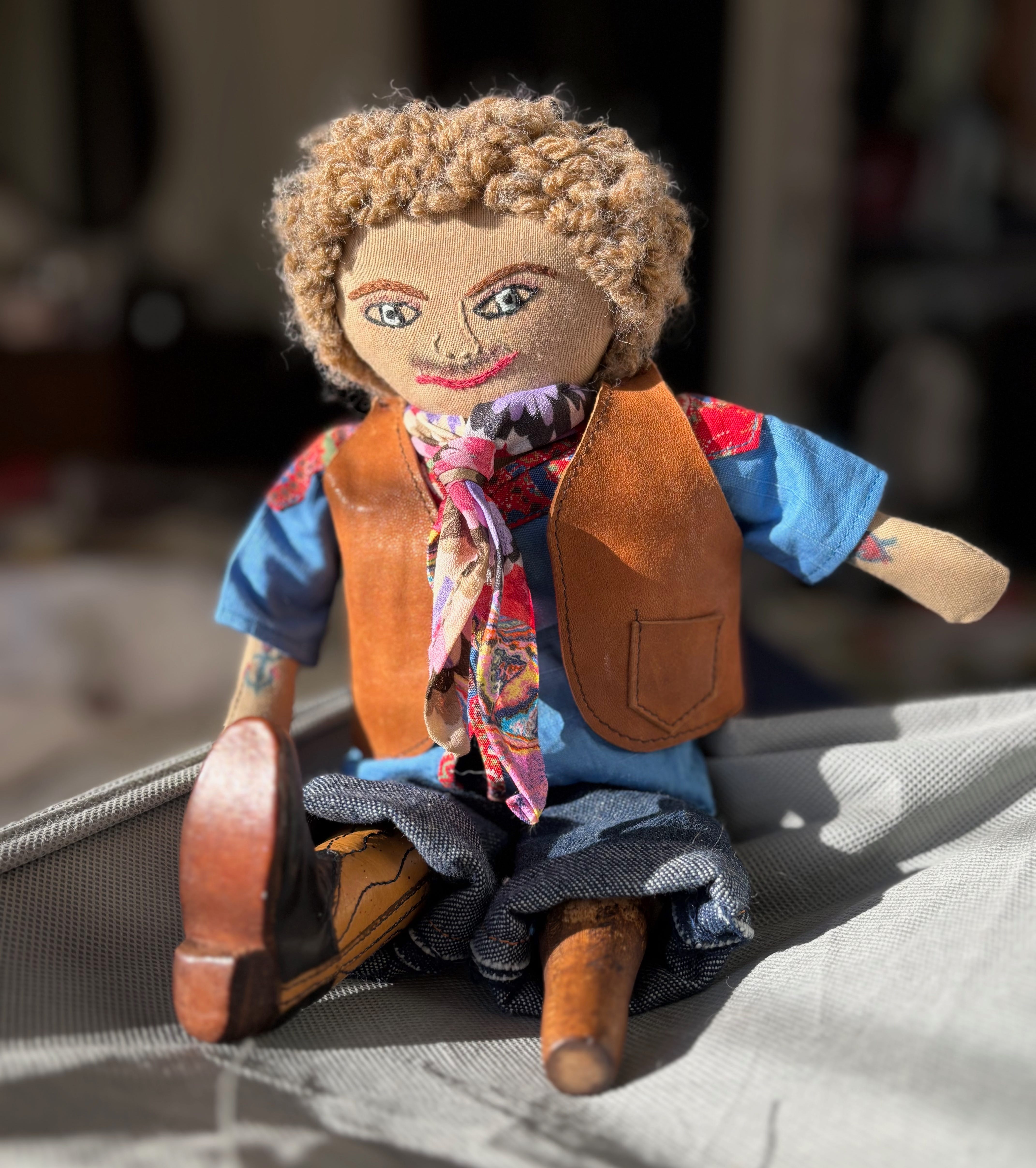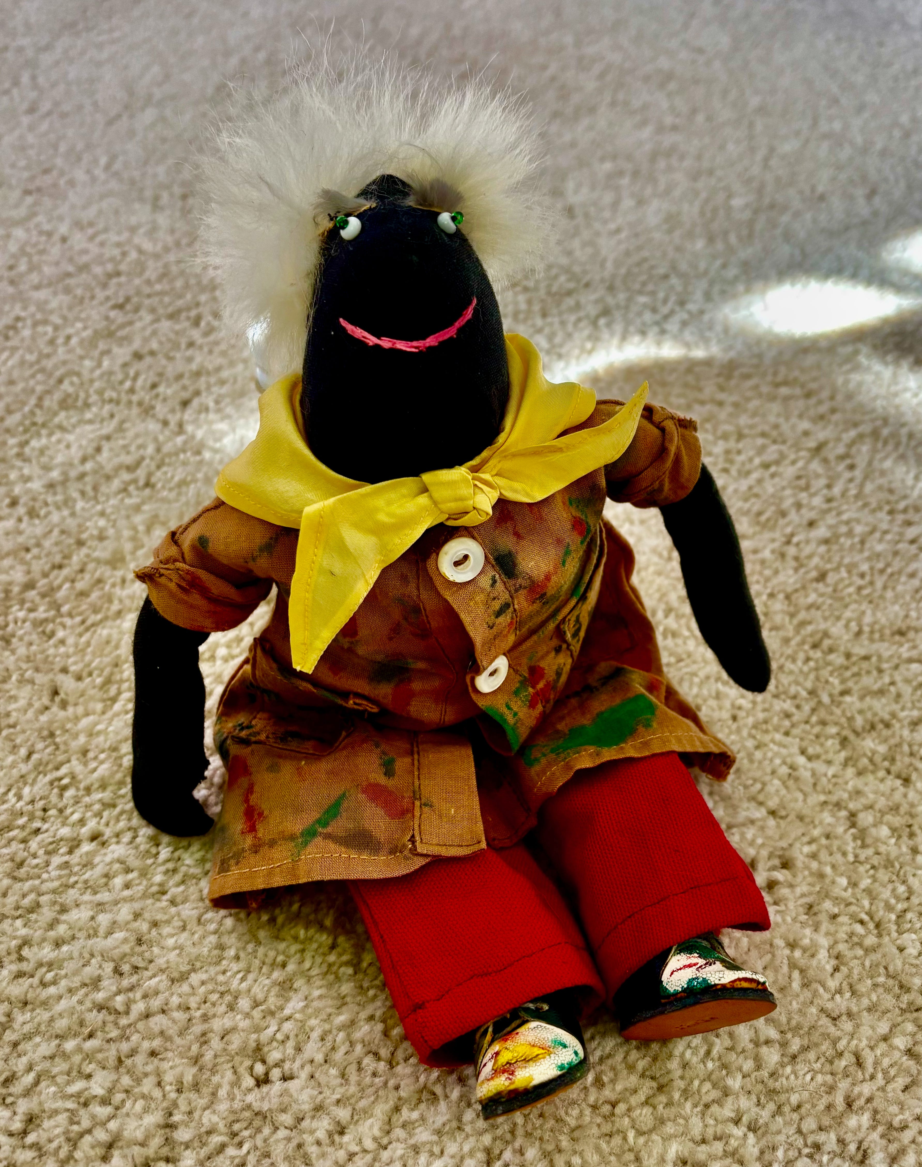 One day, a small doll named Marc arrived from France. A gift for my sister from American expats who were longtime friends of my parents, Marc was soon lost. Mom quickly sewed and stuffed a replacement, dressing the new Marc in handmade clothes. She spotted a cowboy boot on one of her foraging journeys, probably at the Goodwill. Knowing she was unlikely to find its mate, she decided to give Marc a peg leg and fit him for the single boot. And because she felt no life was complete without a dog (she had many dogs over her lifetime), she made Arnold to be Marc’s companion.