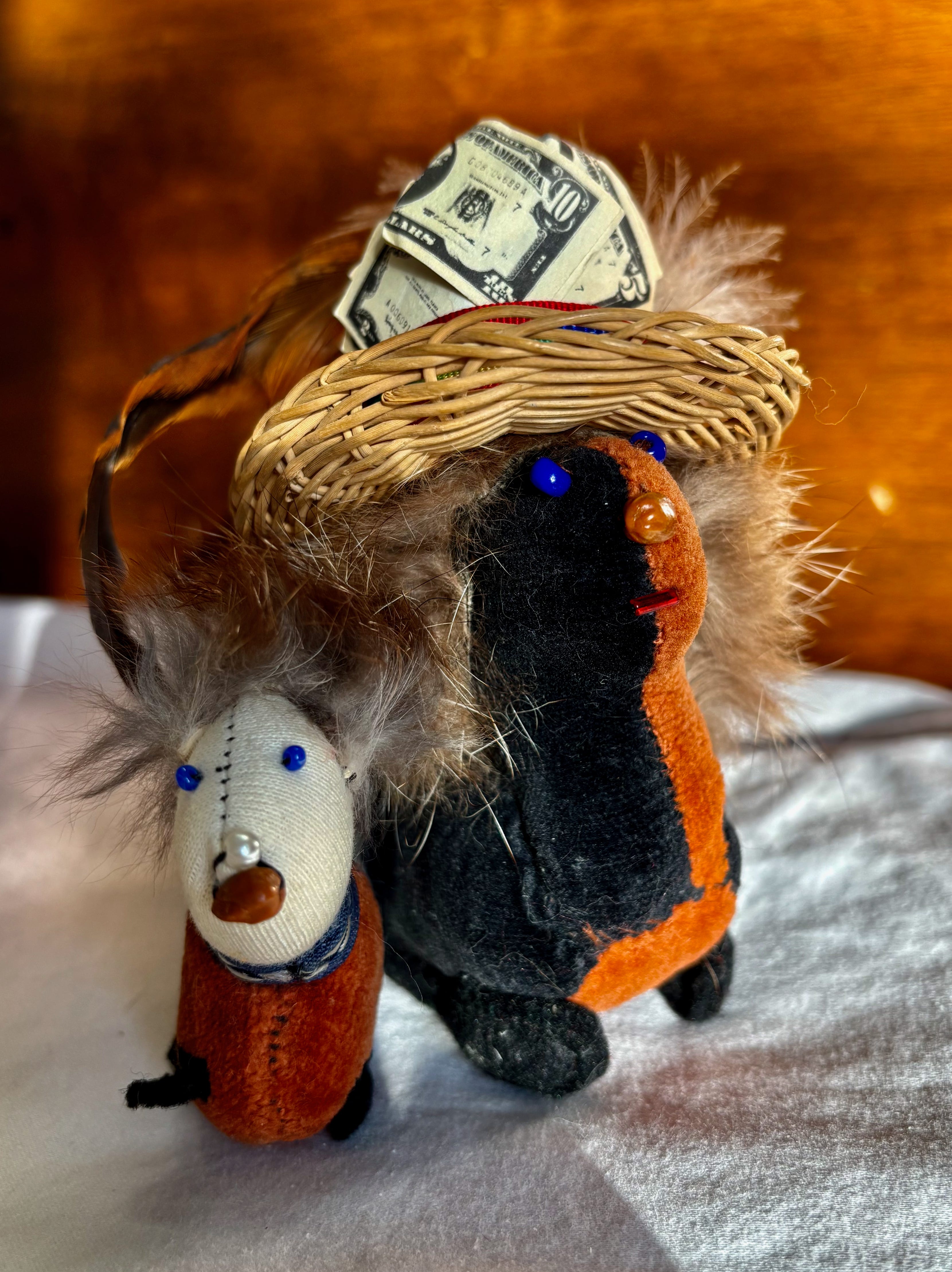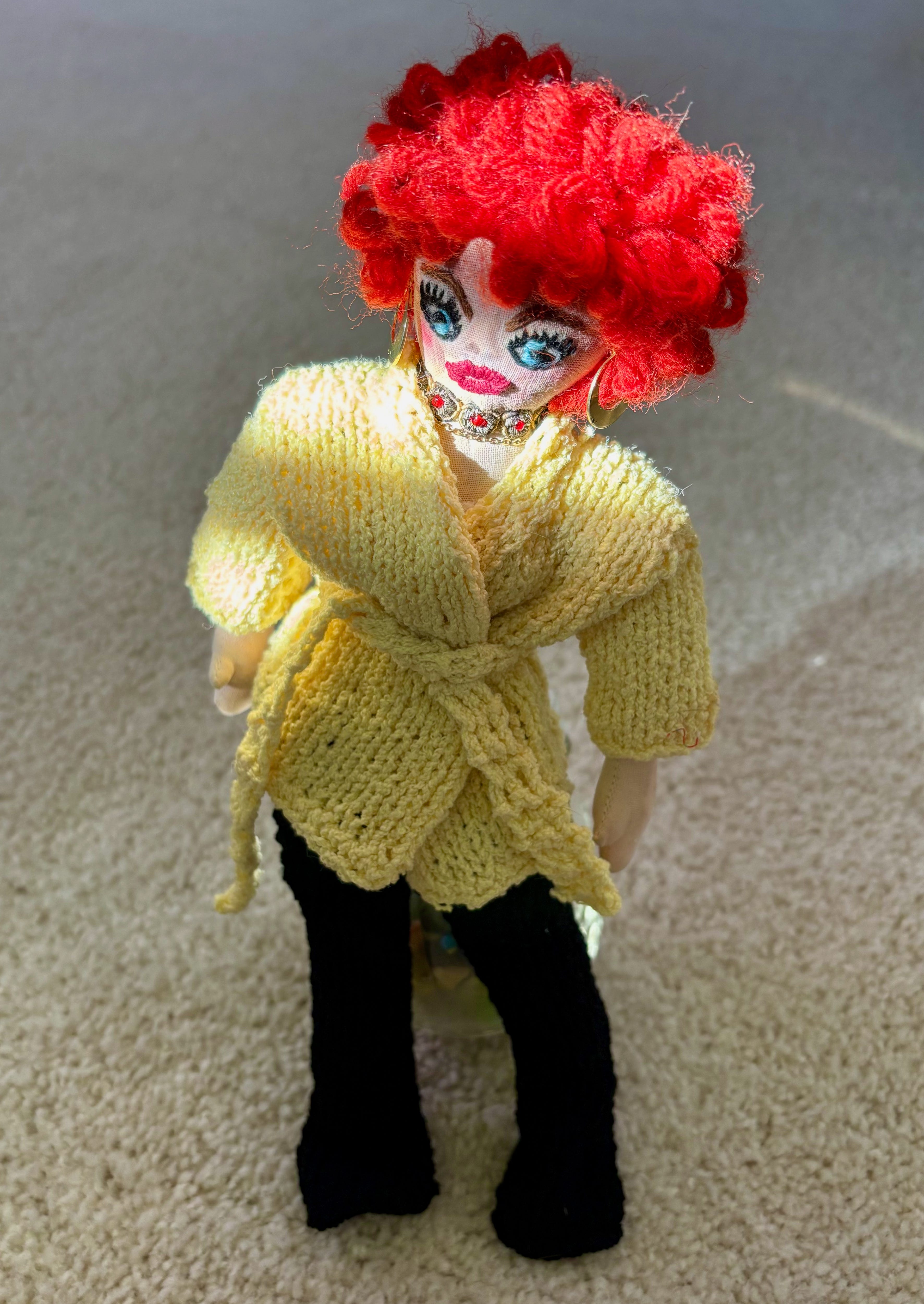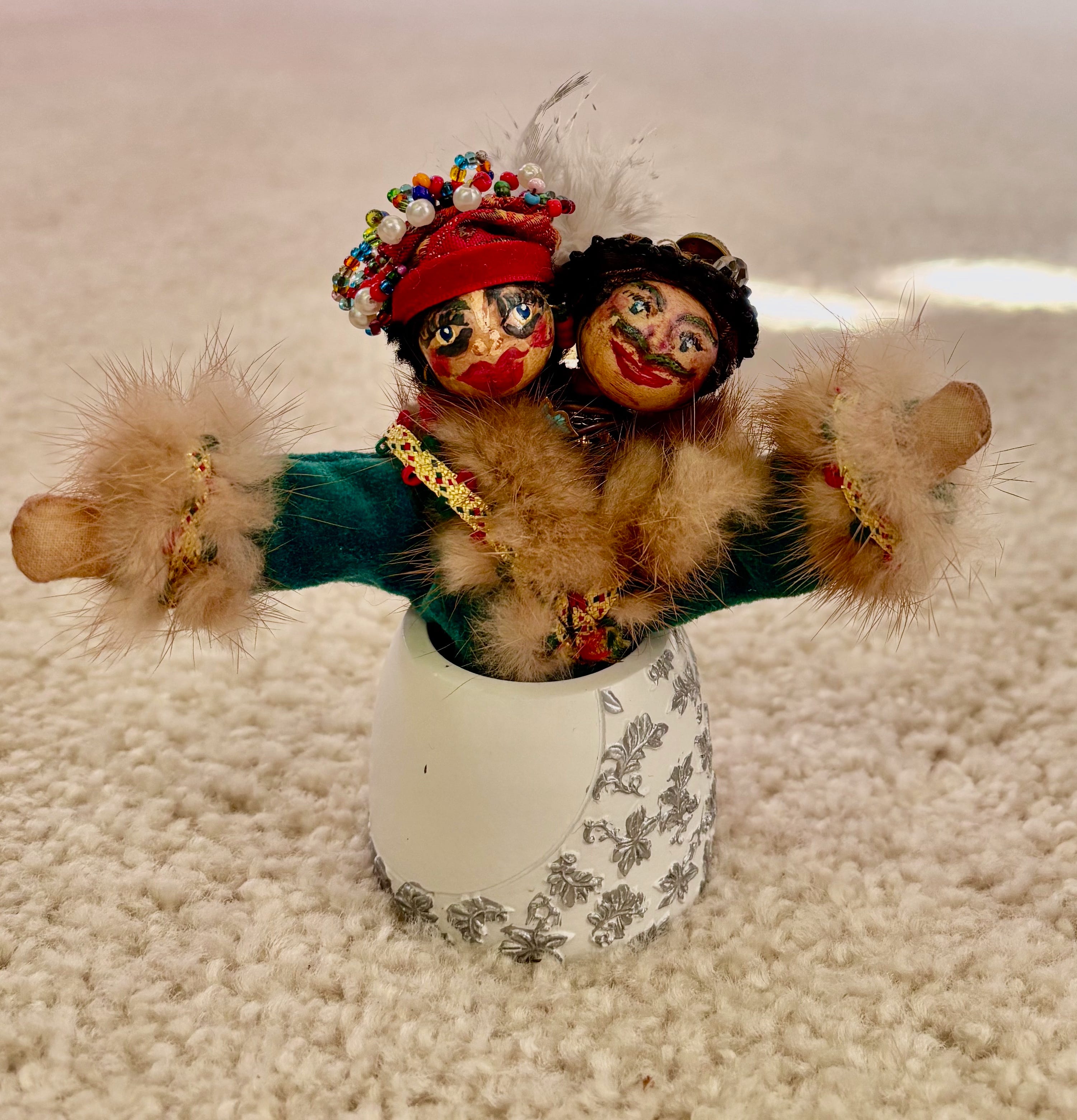 One day, a small doll named Marc arrived from France. A gift for my sister from American expats who were longtime friends of my parents, Marc was soon lost. Mom quickly sewed and stuffed a replacement, dressing the new Marc in handmade clothes. She spotted a cowboy boot on one of her foraging journeys, probably at the Goodwill. Knowing she was unlikely to find its mate, she decided to give Marc a peg leg and fit him for the single boot. And because she felt no life was complete without a dog (she had many dogs over her lifetime), she made Arnold to be Marc’s companion.